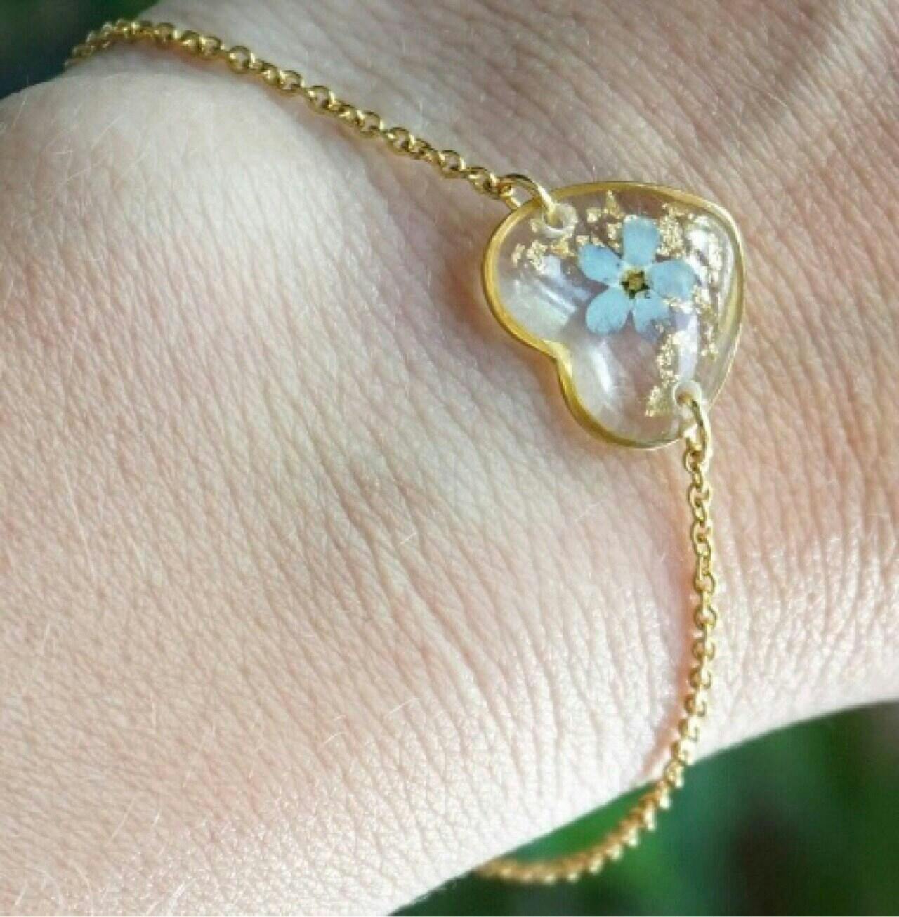 سوار سلسلة مرتبط على شكل قلب مطلي بالذهب مع تعويذة زهرة - لا تنسني - قلب